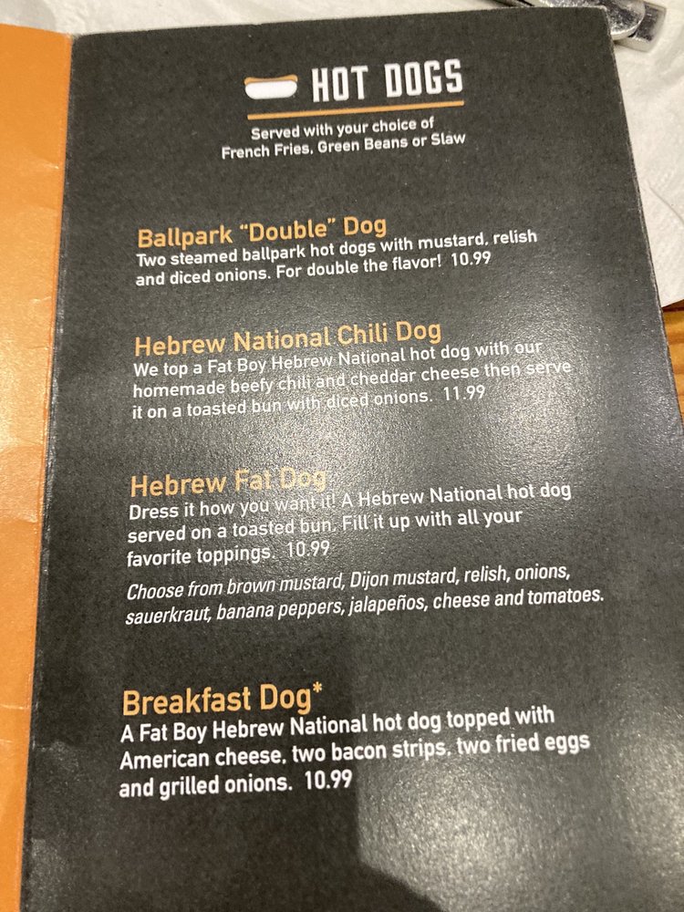 We top a Fat Boy Hebrew National hot dog with our homemade beefy chili and cheddar cheese then serve it on a toasted bun with diced onions